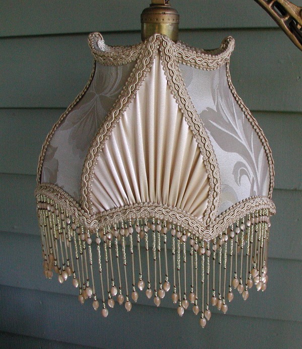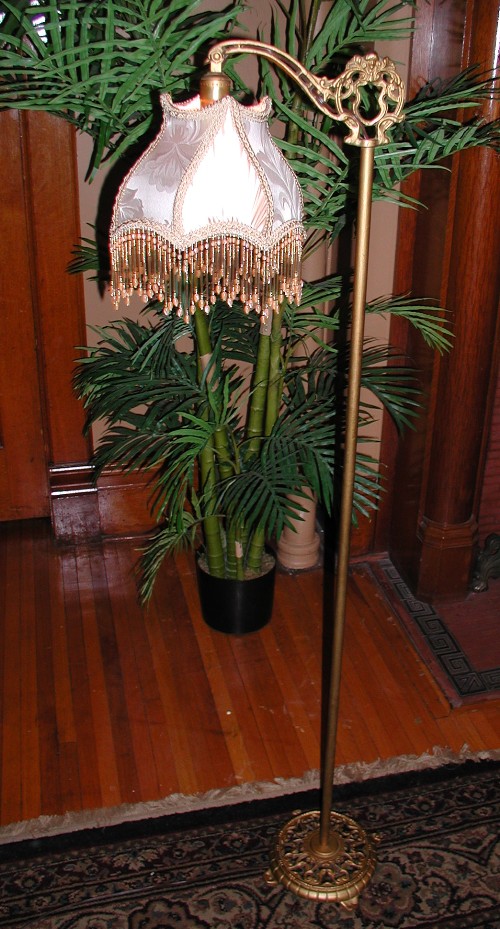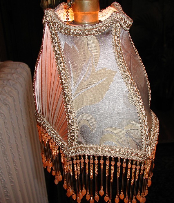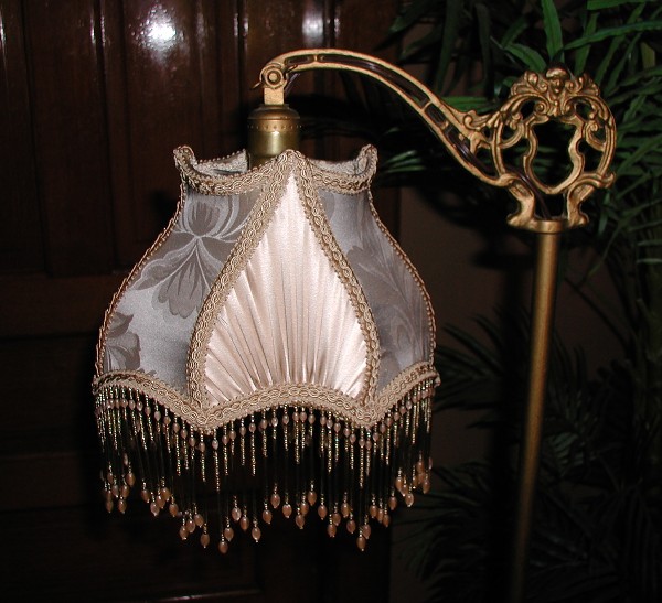 ANTIQUE BRIDGE LAMP AND SHADE #722 "Mini Texas O Style" Sold This petite bridge lamp and lampshade are perfect for a small space. The fabric on the Victorian style lampshade is an elegant piece of silk. The colors are Champaign gold and silvery taupe. The center panel is pleated Champaign charmeuse silk. The 3.5" all glass beads are pearlized Champaign and gold. It has the uno fitter at the top that screws on to the socket. We recommend a 25 - 40 watt narrow candle style bulb. The lamp stand is an antique. It is cast iron with an antique gold paint. The base has a filigree design. The arm has the head of a young girl at the top. It has been rewired and is in working condition. The lamp stand is 54" tall with a 9.5 base. The arm is 10". The shade is 9" x 7" at the bottom and 10" in height including the fringe. This style lamp is perfect next to a chair or beside a bed as a reading light. The shade does have a beautiful glow when lighted. This piece can be shipped in 24 hours. Please call us at Order Desk / Other inquiries 951-240-5663 for additional information. This bridge lampshade is a great reading light as well as a very nice decorative piece. It has the "uno" fitter that allows the shade to be screwed onto the lamp socket. $225.00 for the bridge lamp and lampshade. Size: The lamp stand is 54" tall with a 9.5 base. The arm is 10". The shade is 9" x 7" at the bottom and 10" in height including the fringe. s Co "TOO MUCH IS NEVER ENOUGH" |