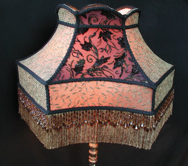 The Kenosha lampshade is a faithful recreation of an original 1930's lampshade that we recovered for a client. It is an eight panel shade. The wires that hold the shade in place are straight across the top and rest on the glass globe. The top opening is large enough to fit over a 10" reflector globe.
