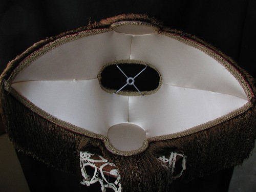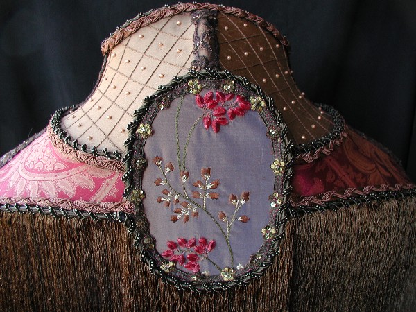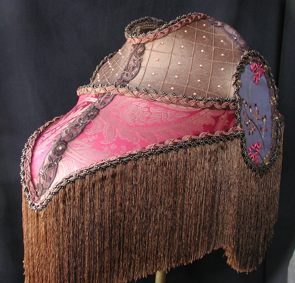 Fringed Shade from Vintage Shades This is a very unique shape for a lampshade. The top fabric is bronze silk with stitched diamond pattern and small pearls. The fabric in the middle is a great looking embroidered silk taffeta in an iridescent plum/gold. Embroidered flowers are bronze, light gold, and dark red chenille. The bottom fabric is a tone on tone scarlet silk -- great gold leaf design. Notice the wonderful imported chenille trim with sequins and beads and the beaded edge on the gimp. The custom dyed fringe is a rich bronze color.This lampshade is 23" wide x 15" tall including the fringe and 13" deep. It is the correct size for a floor lamp or larger table lamp. Price for the lampshade $345.00 Order #VS20281. Order Desk / Other inquiries 951-240-5663 or kelly@vintageshades.com "TOO MUCH IS NEVER ENOUGH"
