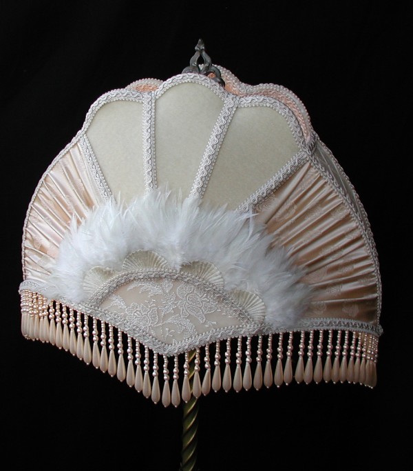 Elegant Victorian Lampshade Done in shades of ecru and cream colors, this wonderful shade is all silk except for the feathers. When lighted it gives off a soft golden glow. A combination of silk, velvet, lace, and feathers make an exotic feminine shade -- embellished with pearls around the bottom. Very reminiscent of romantic times and perfect for your bedroom. This shade will fit a table lamp or floor lamp -- the table lamp in the photo is available. We also have antique floor lamps that would be perfect for this shade. Size: This shade is 18" wide x 15" tall including the fringe x 11" deep. Price $295.00 - $395.00 depending on fabric and trims. Order Number VS20484. Phone 951-240-5663 - Email kelly@vintageshades.com"TOO MUCH IS NEVER ENOUGH"