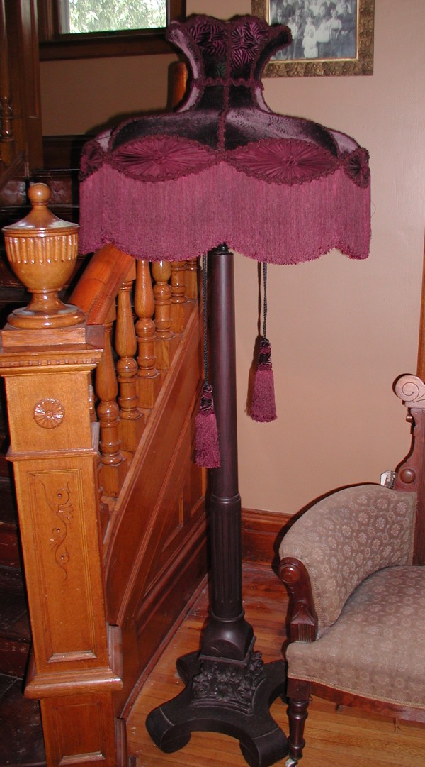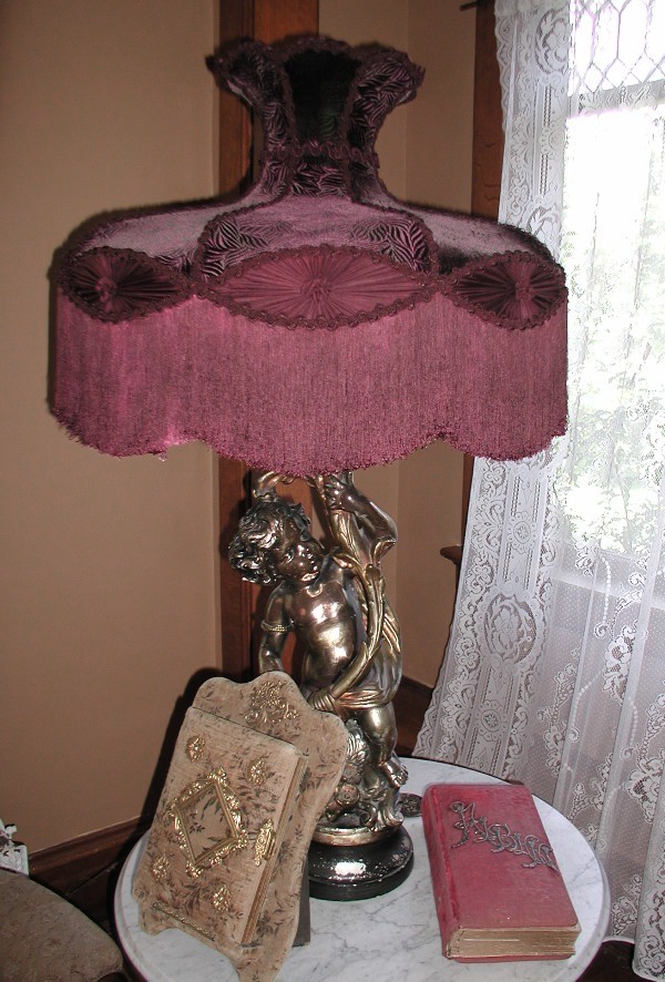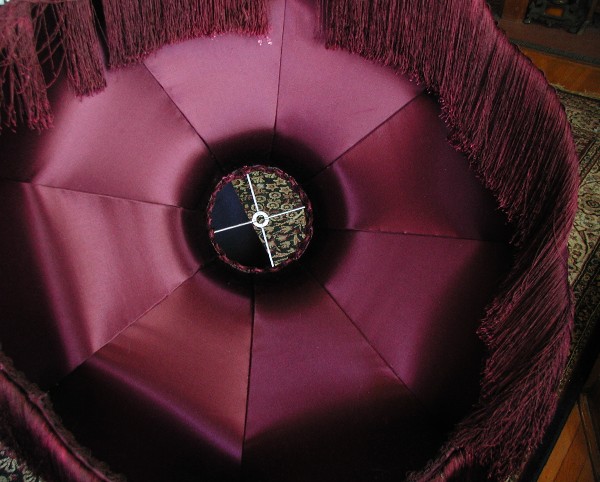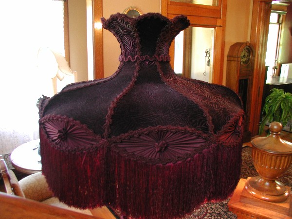Very Unique -- Very Victorian Lampshade This lampshade is an exceptional work of art. It is perfect for large floor or table lamps -- will be a great addition to any home with tall ceilings. Very Unique and Very Victorian!! The main fabric is a vintage looking maroon velvet. Fancy imported trim has been custom dyed to match the fabric. Even the inner lining matches the shade and takes on a flower like look. The eight rosettes along the lower edge of the shade are all silk. The large 28" opening at the bottom of the shade allows for plenty of downward light -- light also travels out the top of the shade. With the purchase of this lampshade, you also receive two large matching tassels. Size: 28" wide at bottom x 20" high / In the photos, the floor lamp is 69" tall and the table lamp is 40" tall. Price $695.00 $ The above photo shows the Crown Lampshade on a table lamp that is 40" tall. Crown shade viewed on a large floor lamp 69" tall. The maroon color is shown best in the above photo. Notice the thick 6" fringe and the fancy braiding. This photo shows the inside of the lampshade. "TOO MUCH IS NEVER ENOUGH"