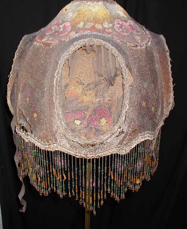 We repair each fabric antique lampshade using as many original fabric and trim pieces as possible. Our expertise in antique lampshade restoration was acquired by restoring many lampshades. On this page are some before and after examples of our antique lampshade restoration. We try to reuse original elements when possible. When original elements are no longer usable we can recreate an original shade with vintage or vintage looking fabrics and trims. Not all shades can be restored, but many can. We are always glad to look at photos of your shade and let you know what we can do. We also make Bed Lamp Shades , Bridge Lamp Shades, and Victorian floor and table shades.